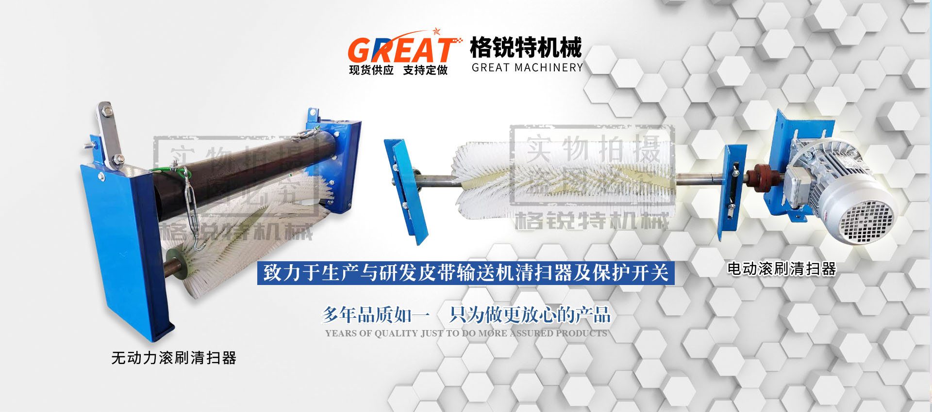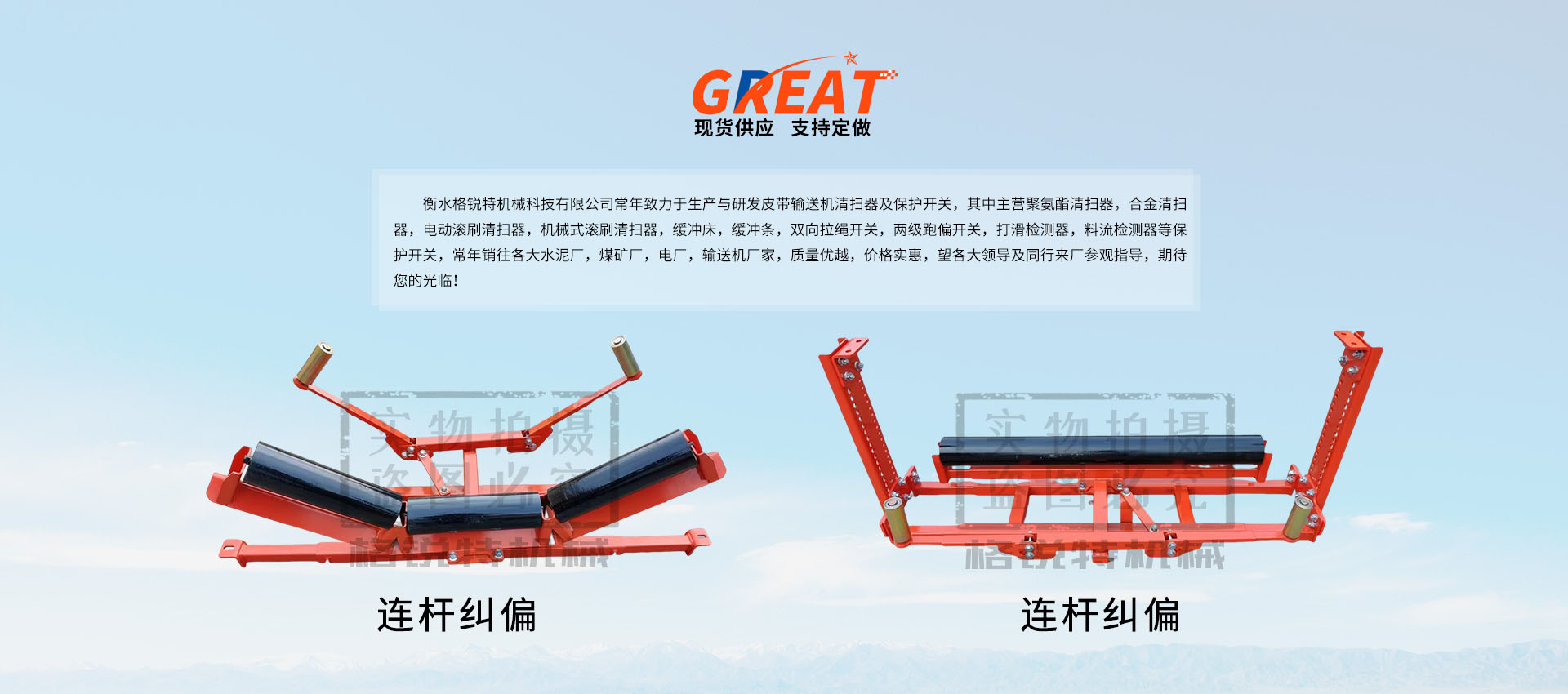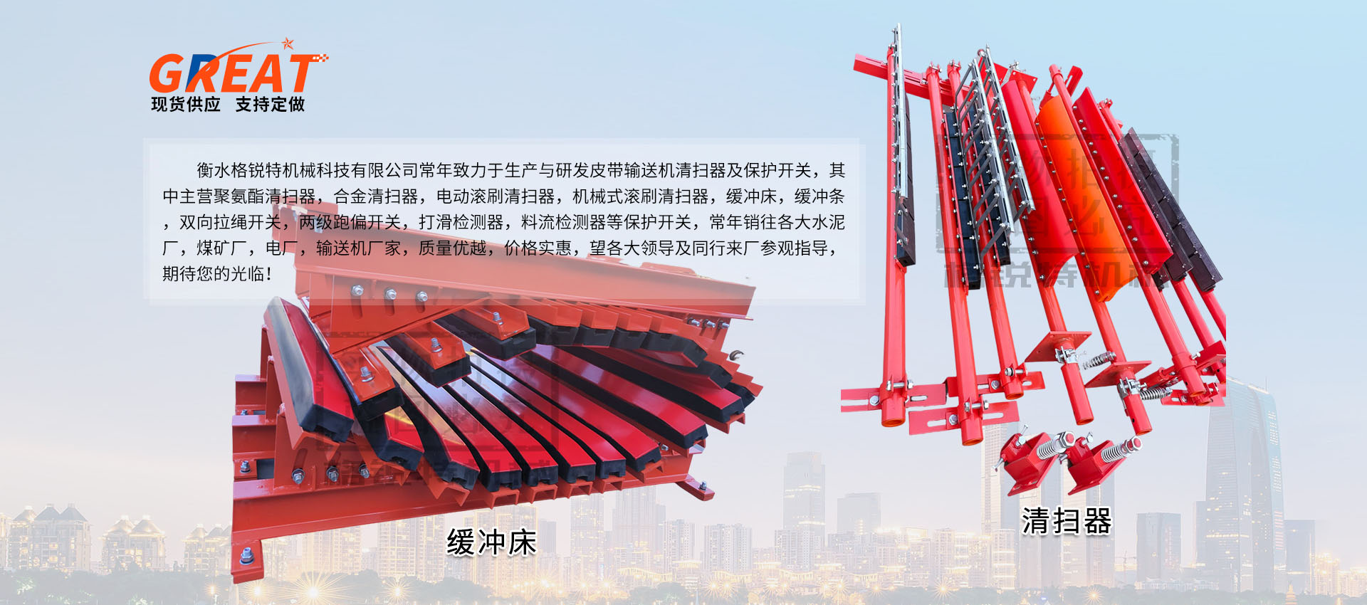 衡水格銳特機(jī)械科技有限公司常年致力于生產(chǎn)與研發(fā)皮帶輸送機(jī)清掃器及保護(hù)開(kāi)關(guān),其中主營(yíng)聚氨酯清掃器,合金清掃器,電動(dòng)滾刷清掃器,機(jī)械式滾刷清掃器,緩沖床,緩沖條,雙向拉繩開(kāi)關(guān),兩級(jí)跑偏開(kāi)關(guān),打滑檢測(cè)器,料流檢測(cè)器等保護(hù)開(kāi)關(guān),常年銷(xiāo)往各大水泥廠(chǎng),煤礦廠(chǎng),電廠(chǎng),輸送機(jī)廠(chǎng)家,質(zhì)量?jī)?yōu)越,價(jià)格實(shí)惠,望各大領(lǐng)導(dǎo)及同行來(lái)廠(chǎng)參觀(guān)指導(dǎo),期待您的光臨?。?!